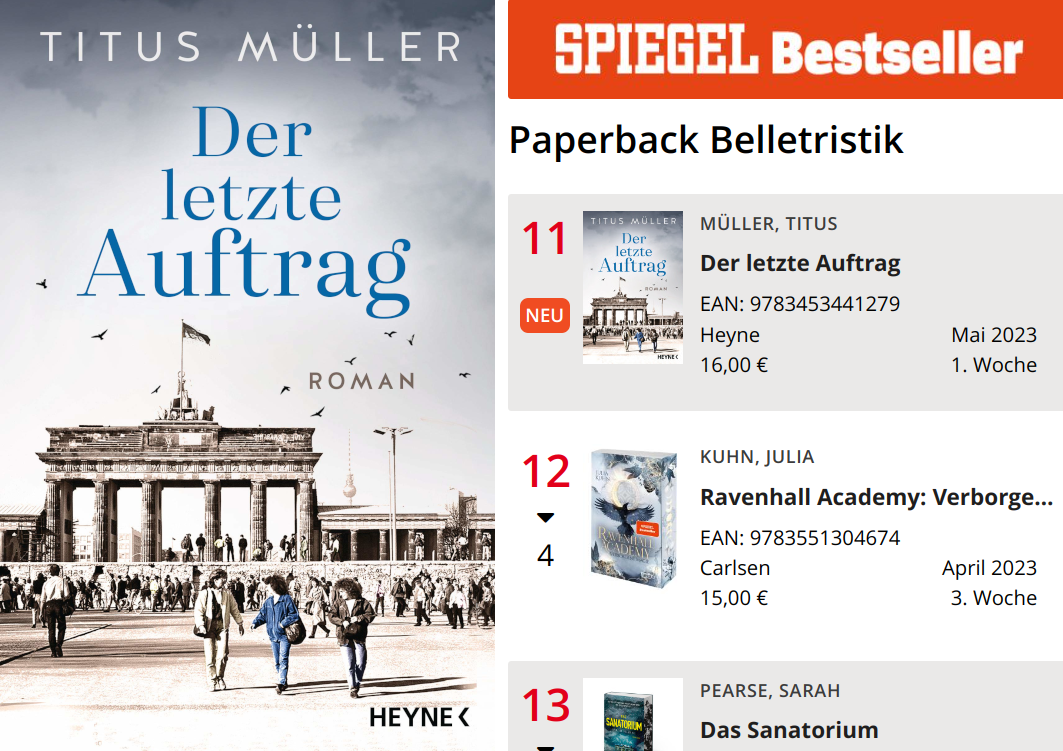 The success of the series is now complete. Following »The Foreign Spy« (18th place) and »The Second Secret« (15th place), »The Last Mission« has risen to 11th place on the Spiegel best seller list. How marvelous!
