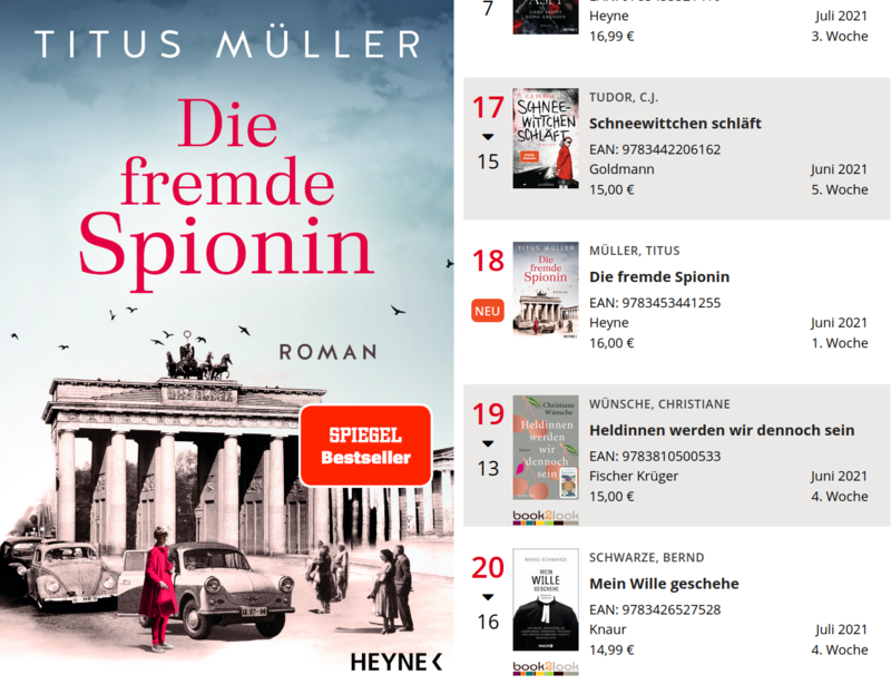 »The Foreign Spy« climbed to 18th place on the Spiegel bestseller list, which means it has earned the red bestseller sticker. Thank you for your support and desire and curiosity in reading! I am enormously chuffed that so many have discovered this novel. When writing it, I didn’t feel like I was doing anything differently than how I normally write, which means that this topic must resonate well with current times. The sales team at Heyne Publishing Company has done excellent work, and then it was up to the booksellers, and you.